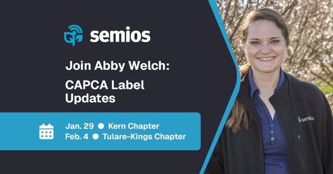 @Semios Semios will be at two upcoming CAPCA label update events, sharing the latest on mating disruption and other Semios offerings. Abby Welch, our Manager of Grower Relations, will be presenting at: • Kern County CAPCA Label Update • Tulare–Kings County CAPCA Label UpdatMzO3Tp